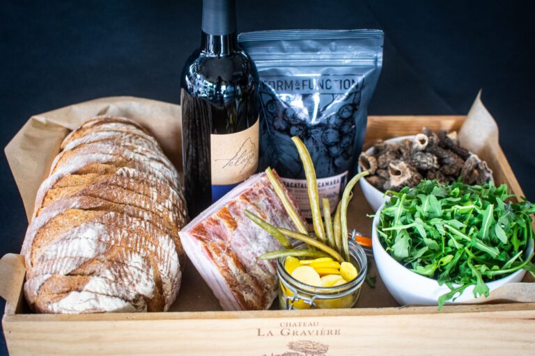 Morgan’s contacts jumped on the idea, and it picked up steam on social media. Soon Morgan was putting together themed offerings like the “Grilling Basket,” featuring Wild Plum’s housemade knackwurst, Purple Sage Farms scallions, Fireside Mallow Co. marshmallows, and more for online ordering.